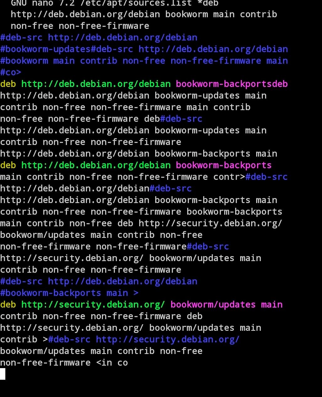 deb http://deb.debian.org/debian bookworm main contrib non-free non-free-firmware #deb-src http://deb.debian.org/debian bookworm main contrib non-free non-free-firmware deb http://deb.debian.org/debian bookworm-updates main contrib non-free non-free-firmware #deb-src http://deb.debian.org/debian bookworm-updates main contrib non-free non-free-firmware deb http://deb.debian.org/debian bookworm-backports main contrib non-free non-free-firmware #deb-src http://deb.debian.org/debian bookworm-backports main contrib non-free non-free-firmware deb http://security.debian.org/ bookworm/updates main contrib non-free non-free-firmware #deb-src http://security.debian.org/ bookworm/updates main contrib non-free non-free-firmware -