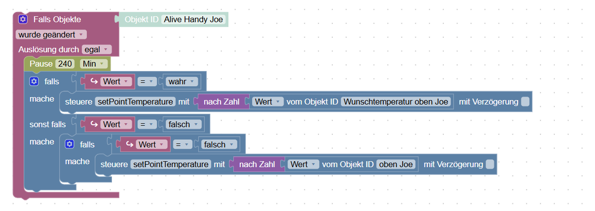 Komme ich nach Hause, soll die Temperatur auf eine Wunschtemperatur (auch in einem Datenpunkt hinterlegt) wieder angehoben werden.