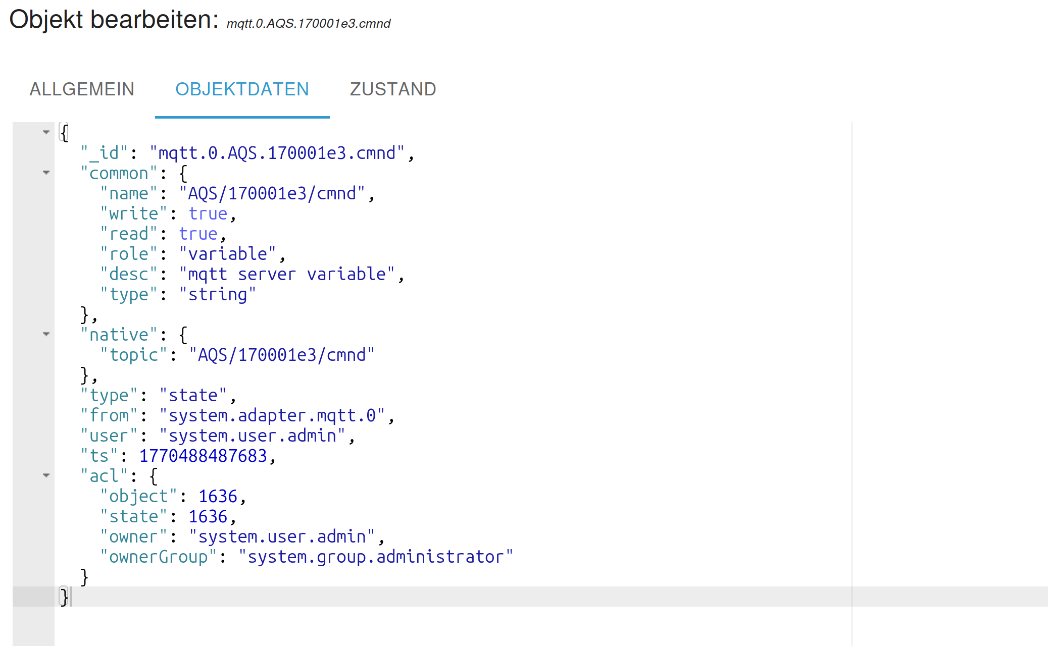 Sie sind per WLAN zu meinem Netzwerk verbunden, MQTT ist aktiviert.Nun bekomme ich auch in den Objekten einen Datenpunkt als JSON angezeigt, dieser kann auch ausgewertet werden.