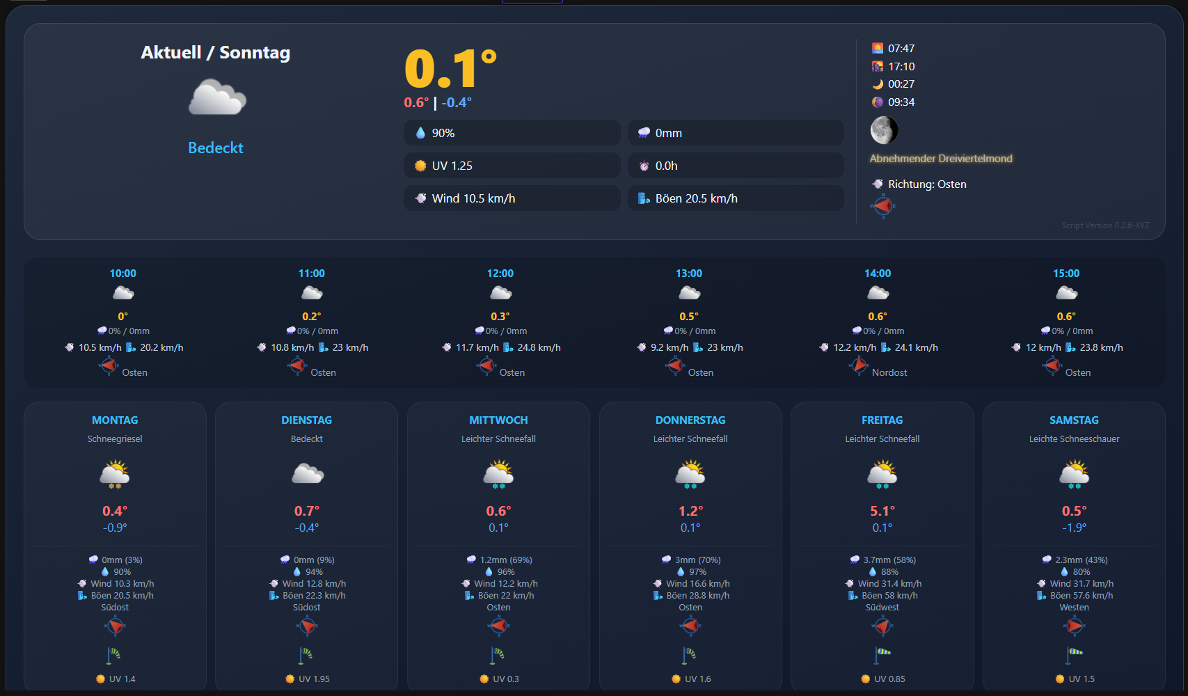 // version: 0.2.6 ////////////////////////////////////////////////// const locationName = 'wo auch immer'; ////////////////////////////////////////////////// // Schriftgrößen-Konfiguration const fontSizeCurrentLabel = '1.3rem'; const fontSizeTempBig = '3.8rem'; const fontSizeDescription = '1.1rem'; const fontSizeInfoGrid = '0.85rem'; const fontSizeSunMoon = '0.8rem'; const fontSizeHourly = '0.75rem'; const fontSizeHourlyRain = '0.65rem'; const fontSizeForecastDay = '0.75rem'; const fontSizeForecastText = '0.65rem'; const fontSizeForecastTempMax = '1rem'; const fontSizeForecastTempMin = '0.85rem'; const fontSizeForecastDetails = '0.65rem'; const version = '0.2.6'; const dpBase = 'open-meteo-weather.0.' + locationName + '.weather'; const forecast = dpBase + '.forecast'; const targetDP = '0_userdata.0.Wetter_Widget_HTML'; // Sprach-Check let sysLang = 'de'; try { const systemConfig = getObject("system.config"); sysLang = systemConfig.common.language || 'de'; } catch (e) { sysLang = 'de'; } const i18n = { de: { current: "Aktuell" }, en: { current: "Current" } }; const lang = i18n[sysLang] || i18n['en']; // DP anlegen falls nicht vorhanden if (!existsState(targetDP)) { createState(targetDP, '', { name: 'Weather Widget for VIS', type: 'string', role: 'html' }); } // ------------------------------------------------------------ // Hilfsfunktionen // ------------------------------------------------------------ // HEUTE aus JavaScript, kompakt function getToday() { const d = new Date(); const day = String(d.getDate()).padStart(2, "0"); const month = String(d.getMonth() + 1).padStart(2, "0"); const year = d.getFullYear(); return `${day}.${month}.${year}`; } function getVal(id, unit = "") { if (!existsState(id)) return "--" + unit; let state = getState(id); if (!state || state.val === null || state.val === undefined) return "--" + unit; return state.val + unit; } function getImg(id, size = "20px") { if (!existsState(id)) return ""; let state = getState(id); if (!state || !state.val) return ""; return `<img src="${state.val}" style="width:${size}; height:${size}; object-fit:contain;">`; } function getNum(id) { let s = getState(id); return (!s || s.val === null || s.val === undefined) ? null : Number(s.val); } function getSunHours(id) { let sec = getNum(id); if (sec === null) return "--h"; return (sec / 3600).toFixed(1) + "h"; } // ------------------------------------------------------------ // Hauptfunktion // ------------------------------------------------------------ function updateWeatherWidget() { // ⭐ AB HIER: ALLES UNVERÄNDERT GELASSEN let html = ` <style> @keyframes moonGlow { 0% { filter: drop-shadow(0 0 2px #fbbf24); opacity: 0.85; } 50% { filter: drop-shadow(0 0 6px #fbbf24); opacity: 1; } 100% { filter: drop-shadow(0 0 2px #fbbf24); opacity: 0.85; } } .moon-anim { animation: moonGlow 3.5s ease-in-out infinite; } .w-container { font-family: 'Segoe UI', sans-serif; background: linear-gradient(160deg, #1e293b 0%, #0f172a 100%); color: #f1f5f9; padding: 10px; border-radius: 20px; border: 1px solid #334155; box-shadow: 0 10px 30px rgba(0,0,0,0.5); } .w-header { display: grid; grid-template-columns: 1.2fr 1.5fr 1fr; gap: 10px; background: rgba(255,255,255,0.05); padding: 10px; border-radius: 10px; margin-bottom: 10px; border: 1px solid rgba(255,255,255,0.1); } .w-temp-big { font-size: ${fontSizeTempBig}; font-weight: 900; color: #fbbf24; line-height: 1; } .w-desc { font-size: ${fontSizeDescription}; color: #38bdf8; font-weight: 600; } .w-info-grid { display: grid; grid-template-columns: 1fr 1fr; gap: 8px; font-size: ${fontSizeInfoGrid}; margin-top: 10px; } .w-info-item { background: rgba(0,0,0,0.2); padding: 6px 10px; border-radius: 10px; display: flex; align-items: center; gap: 5px; } .w-sun-moon { font-size: ${fontSizeSunMoon}; line-height: 1.6; border-left: 1px solid rgba(255,255,255,0.1); padding-left: 15px; } .w-hourly { display: grid; grid-template-columns: repeat(6, 1fr); gap: 8px; margin-bottom: 10px; background: rgba(0,0,0,0.15); padding: 10px; border-radius: 15px; } .w-h-item { text-align: center; font-size: ${fontSizeHourly}; } .w-h-time { font-weight: bold; color: #38bdf8; } .w-h-temp { font-weight: bold; color: #fbbf24; display: block; } .w-h-rain { font-size: ${fontSizeHourlyRain}; color: #94a3b8; } .w-forecast { display: grid; grid-template-columns: repeat(6, 1fr); gap: 10px; } .w-fc-day { background: rgba(255,255,255,0.03); padding: 12px 8px; border-radius: 18px; text-align: center; border: 1px solid rgba(255,255,255,0.05); display: flex; flex-direction: column; justify-content: space-between; } .w-fc-name { font-weight: bold; color: #38bdf8; font-size: ${fontSizeForecastDay}; text-transform: uppercase; margin-bottom: 2px; } .w-fc-text { font-size: ${fontSizeForecastText}; color: #94a3b8; min-height: 2.2em; display: flex; align-items: center; justify-content: center; text-align: center; margin-bottom: 5px; } .w-fc-temp-max { color: #f87171; font-weight: bold; font-size: ${fontSizeForecastTempMax}; display: block; text-align: center; } .w-fc-temp-min { color: #60a5fa; font-size: ${fontSizeForecastTempMin}; display: block; margin-bottom: 5px; text-align: center; } .w-fc-day img { margin: 2px 0 4px 0; } .w-fc-details { font-size: ${fontSizeForecastDetails}; color: #94a3b8; border-top: 1px solid rgba(255,255,255,0.05); margin-top: 8px; padding-top: 8px; } </style> <div class="w-container"> <div class="w-header"> <div style="text-align: center;"> <div style="font-size:${fontSizeCurrentLabel}; font-weight:bold;"> ${lang.current} / ${getVal(forecast + '.day0.name_day')} </div> <div style="font-size:0.75rem; color:#94a3b8; margin-top:0;"> ${getToday()} </div> ${getImg(dpBase + '.current.icon_url', "80px")} <div class="w-desc">${getVal(dpBase + '.current.weather_text')}</div> </div> <div> <div class="w-temp-big">${getVal(dpBase + '.current.temperature_2m', " °C")}</div> <div style="font-weight:bold; margin-bottom:10px;"> <span style="color:#f87171">${getVal(forecast + '.day0.temper