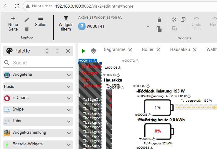 Ja, habe ich eben gemacht. Mir fällt auf , dass im Editor in der Palette links der Eintrag zu "vis-2-widgets-inventwo" fehlt und in der Widget-Liste steht ein ? z.B. bei w000132: