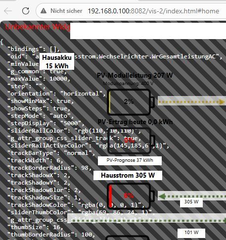 iobroker.vis-2@2.13.3 index-BsOYribJ.js:7770 ██╗ ██████╗ ██████╗ ██████╗ ██████╗ ██╗ ██╗███████╗██████╗ ██║██╔═══██╗██╔══██╗██╔══██╗██╔═══██╗██║ ██╔╝██╔════╝██╔══██╗ ██║██║ ██║██████╔╝██████╔╝██║ ██║█████╔╝ █████╗ ██████╔╝ ██║██║ ██║██╔══██╗██╔══██╗██║ ██║██╔═██╗ ██╔══╝ ██╔══██╗ ██║╚██████╔╝██████╔╝██║ ██║╚██████╔╝██║ ██╗███████╗██║ ██║ ╚═╝ ╚═════╝ ╚═════╝ ╚═╝ ╚═╝ ╚═════╝ ╚═╝ ╚═╝╚══════╝╚═╝ ╚═╝ index-BsOYribJ.js:7777 Nice to see you here! :) Join our dev community here https://github.com/ioBroker/ioBroker or here https://github.com/iobroker-community-adapters index-BsOYribJ.js:7777 Help us to create open source project with reactJS! index-BsOYribJ.js:7777 See you :) blob:http://192.168.0.100:8082/8d6a0a45-112a-4afc-8bba-cef3ad931f43:1 Manifest: property 'start_url' ignored, URL is invalid. blob:http://192.168.0.100:8082/8d6a0a45-112a-4afc-8bba-cef3ad931f43:1 Manifest: property 'src' ignored, URL is invalid. index-BelaSnNa.js:7246 Skip script "jqplot" widgets/jqplot/js/jquery.jqplot.min.js 2index-BelaSnNa.js:7246 Skip script "jqplot" inline index-BelaSnNa.js:7246 Skip script "jqui" lib/js/jquery-ui-timepicker-addon-1.6.3.js index-BelaSnNa.js:7246 Skip script "jqui" inline 3index-BelaSnNa.js:7246 Skip script "swipe" inline index-BelaSnNa.js:7246 Skip script "tabs" inline index-BsOYribJ.js:8208 Translate: jqui_widgetTitle index-BsOYribJ.js:8208 Translate: jqui_Write state index-BsOYribJ.js:8208 Translate: jqui_Close index-BsOYribJ.js:8208 Translate: jqui_input index-BsOYribJ.js:8208 Translate: jqui_off index-BsOYribJ.js:8208 Translate: jqui_on index-BsOYribJ.js:8208 Translate: Value visView-CDuz12o6.js:22279 Ignored jqplot/tplJqplotGauge because not used in project visView-CDuz12o6.js:22279 Ignored swipe/tplCarousel because not used in project index-BelaSnNa.js:7400 [2026-03-07T19:31:30.419Z] +SUBSCRIBE: alias.0.Hausstrom.Hausakku.BatterieLadezustand index-BelaSnNa.js:7400 [2026-03-07T19:31:30.426Z] +SUBSCRIBE: alias.0.Hausstrom.Allgemein.PrioritaetsText index-BelaSnNa.js:7400 [2026-03-07T19:31:30.429Z] +SUBSCRIBE: alias.0.Hausstrom.Allgemein.StromleistungHaus index-BelaSnNa.js:7400 [2026-03-07T19:31:30.431Z] +SUBSCRIBE: alias.0.Hausstrom.Allgemein.StromLeistungNot index-BelaSnNa.js:7400 [2026-03-07T19:31:30.433Z] +SUBSCRIBE: alias.0.Diagrammdaten.StromPV index-BelaSnNa.js:7400 [2026-03-07T19:31:30.435Z] +SUBSCRIBE: alias.0.Hausstrom.PvModule.PvErzeugung index-BelaSnNa.js:7400 [2026-03-07T19:31:30.437Z] +SUBSCRIBE: alias.0.Klimatisierung.Boiler.Boilertemperatur index-BelaSnNa.js:7400 [2026-03-07T19:31:30.438Z] +SUBSCRIBE: alias.0.Hausstrom.Allgemein.StromleistungGenerator index-BelaSnNa.js:7400 [2026-03-07T19:31:30.440Z] +SUBSCRIBE: alias.0.Hausstrom.Wallbox.Allgemein.LeistungIst index-BelaSnNa.js:7400 [2026-03-07T19:31:30.442Z] +SUBSCRIBE: alias.0.Hausstrom.Wallbox.Allgemein.Kabelstatustext index-BelaSnNa.js:7400 [2026-03-07T19:31:30.443Z] +SUBSCRIBE: alias.0.Hausstrom.Wechselrichter.GenNetzsignalText index-BelaSnNa.js:7400 [2026-03-07T19:31:30.444Z] +SUBSCRIBE: alias.0.Hausstrom.Wechselrichter.WrTemperaturM01 index-BelaSnNa.js:7400 [2026-03-07T19:31:30.445Z] +SUBSCRIBE: alias.0.Hausstrom.Wechselrichter.WrTemperaturS02 index-BelaSnNa.js:7400 [2026-03-07T19:31:30.447Z] +SUBSCRIBE: alias.0.Hausstrom.Wechselrichter.WrGesamtleistungAC index-BelaSnNa.js:7400 [2026-03-07T19:31:30.448Z] +SUBSCRIBE: alias.0.Hausstrom.Wechselrichter.WrGesamtleistungDC index-BelaSnNa.js:7400 [2026-03-07T19:31:30.452Z] +SUBSCRIBE: alias.0.Klimatisierung.Boiler.Boilerregler index-BelaSnNa.js:7400 [2026-03-07T19:31:30.453Z] +SUBSCRIBE: alias.0.Klimatisierung.Boiler.Boilerleistung index-BelaSnNa.js:7400 [2026-03-07T19:31:30.454Z] +SUBSCRIBE: alias.0.Hausstrom.Allgemein.StromverlustleistungWR index-BelaSnNa.js:7400 [2026-03-07T19:31:30.455Z] +SUBSCRIBE: alias.0.Hausstrom.Hausakku.BatterieLeistung index.js:13 iobroker.echarts-show@1.9.2" console.ts:40 Read till Sat Mar 07 2026 20:31:31 GMT+0100 (Mitteleuropäische Normalzeit) [NEW] Explain Console errors by using Copilot in Edge: click to explain an error. Learn moreUnd wenn du nochmal ein log postest